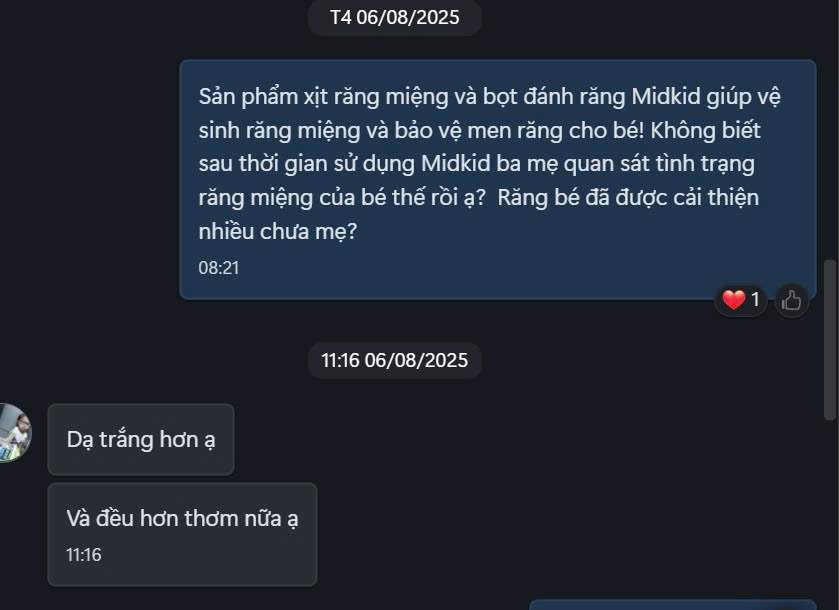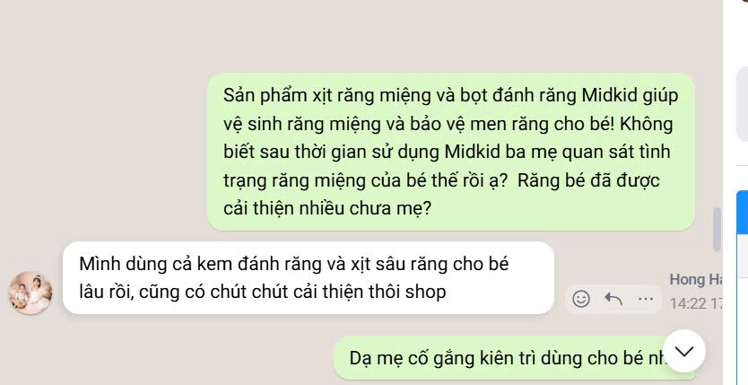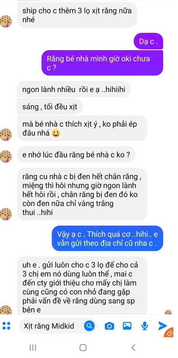"Sản phẩm dùng rất thích, mùi thơm dễ chịu. Bé nhà mình trước lười đánh răng lắm mà giờ cứ đòi mẹ cho dùng Midkid."